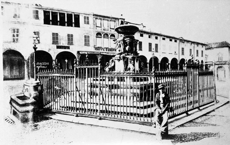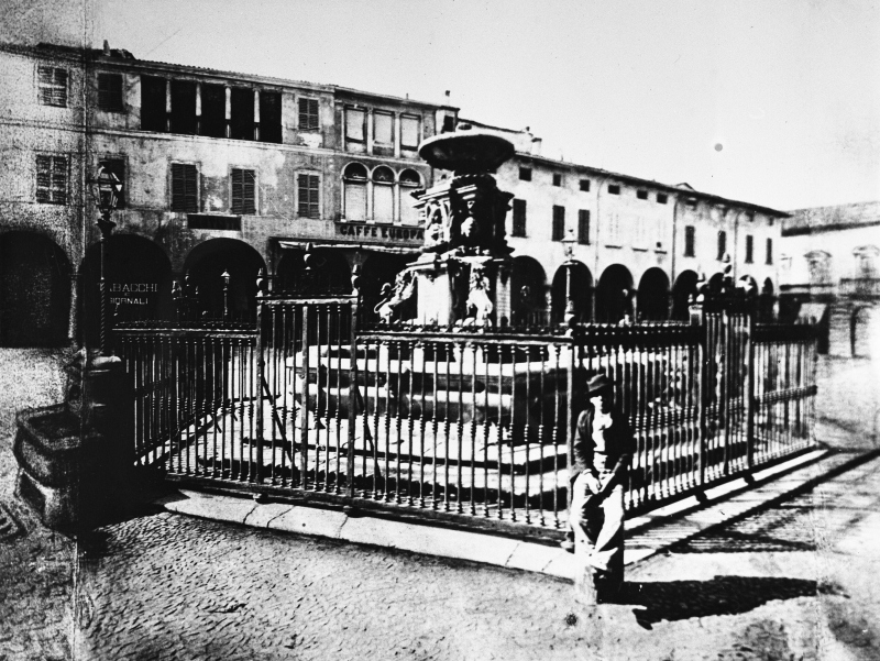 Da notare come il fotografo abbia allargato con disegno il campo visivo a sinistra e a destra. Si noti anche che a sinistra, attaccata alla cancellata, c'è una delle prime fontanelle della piazza. La cancellata fu tolta nel 1897.Donazione: