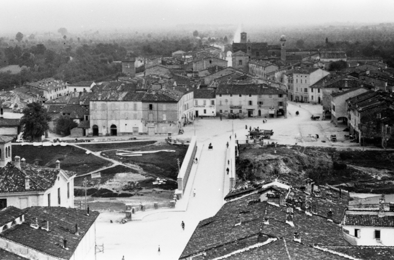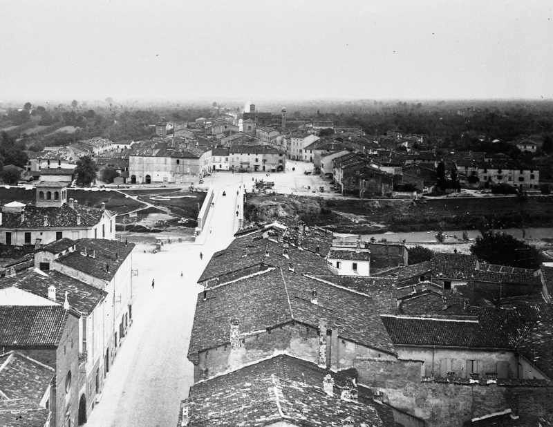 Borgo d'Urbecco visto dall'alto, molto probabilmente dal campanile della Chiesa dei Servi. Si vedono gli attuali Corso Saffi, Ponte delle Grazie, Corso Europa e la Via Emilia in direzione Forlì.Ulteriori informazioni