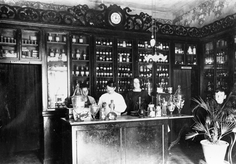 Dietro al bancone è ritratto Michele Piazza insieme alle due commesse della farmacia. Il ragazzo dietro la pianta è Francesco, figlio di Michele che poi è diventato medico di guerra e poi ostetrico, facendo nascere migliaia di bambini a Faenza.