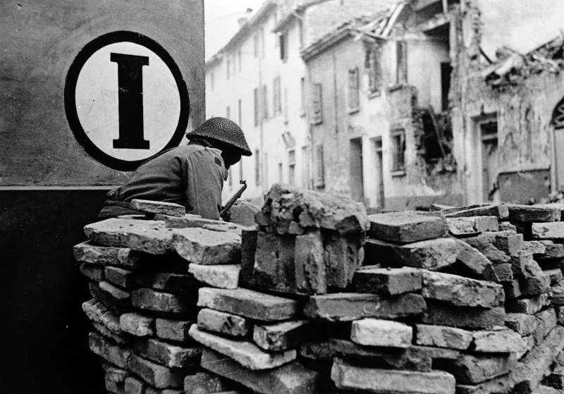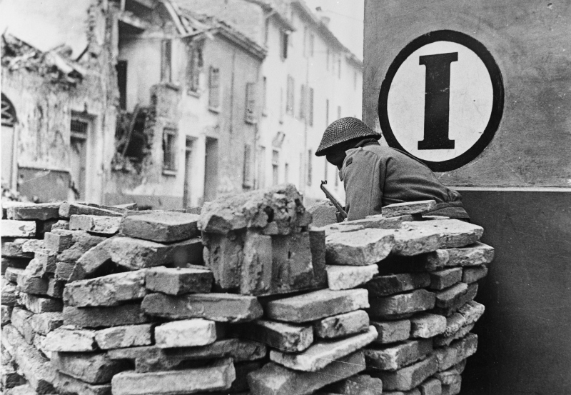 Eighth Army a Faenza. A New Zealand Infantryman peers cautiously around a corner during a hunt for stray snipers in Faenza. Un fante neozelandese si sporge con cautela da dietro un angolo durante un'operazione per stanare alcuni cecchini a Faenza.Donazione: