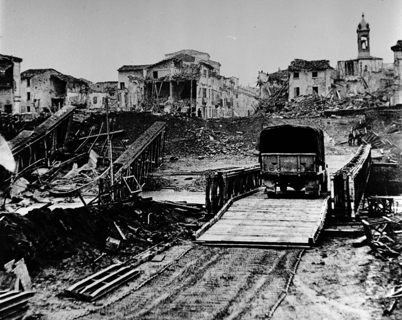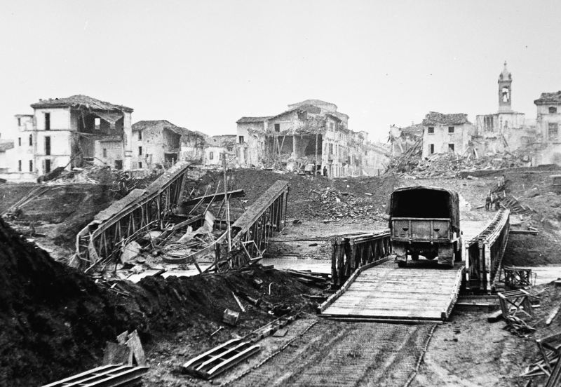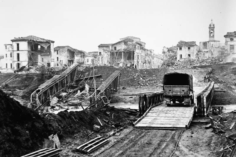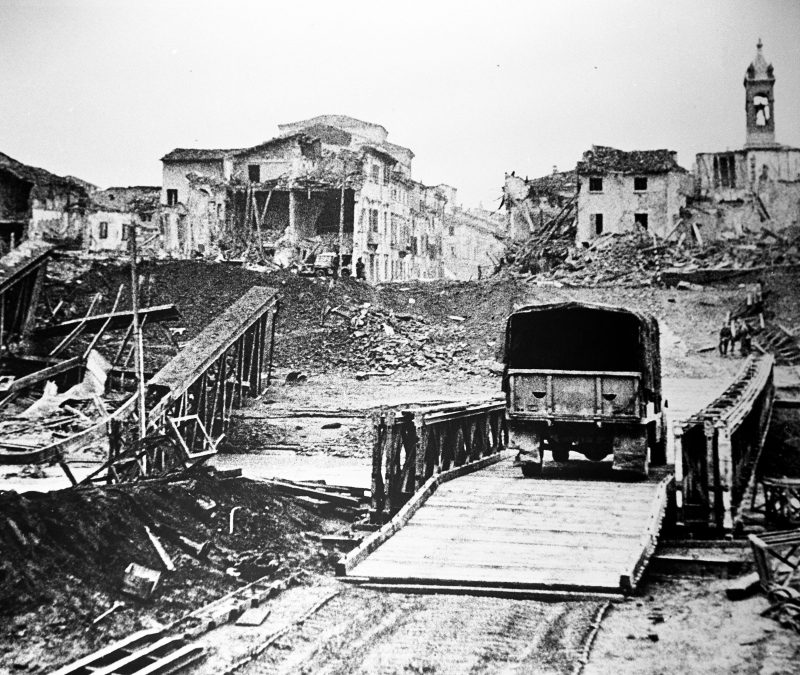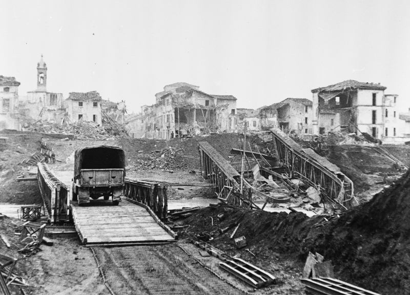Eighth Army - Faenza A completed Bailey Bridge over the River Lamone, built next to the blown bridge, seen on the left. Eighth Army - Faenza Il ponte Bailey completato sul fiume Lamone, costruito vicino al ponte distrutto che si vede sulla sinistra.