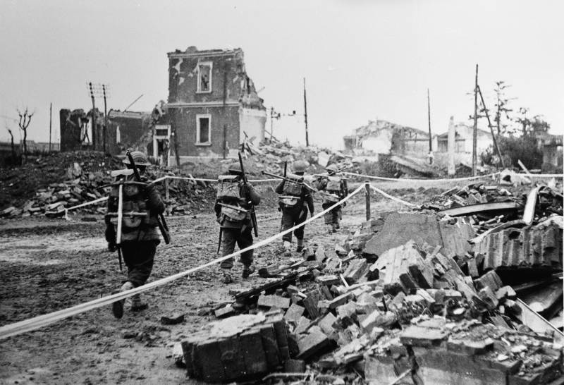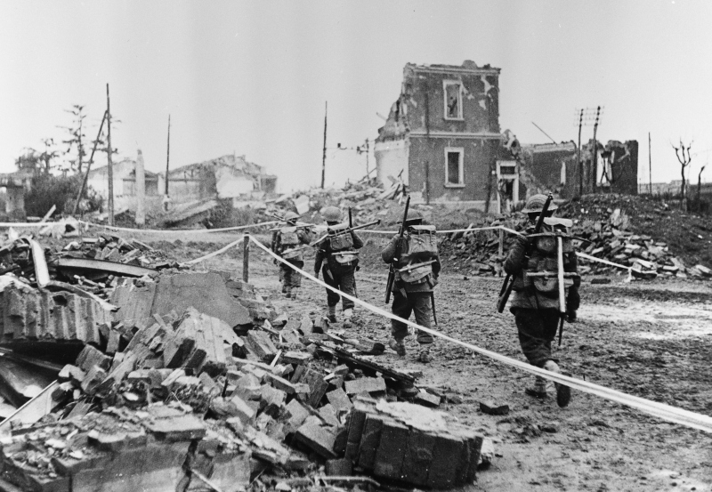 Eighth Army - Faenza Infantry of the Gurkha Regiment advancing along the road to San Silvestro. Eighth Army - Faenza Fanteria del reggimento Gurkha avanza su una strada verso San Silvestro.Donazione: