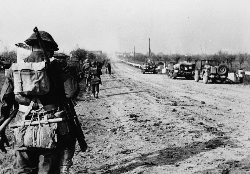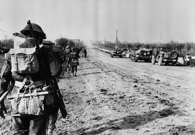 Alcuni fanti del Battaglione 1/6 East Surray marciano lungo la Via Emilia tra Faenza e Forlì all'inseguimento dei nemici, ritiratisi durante la notte.