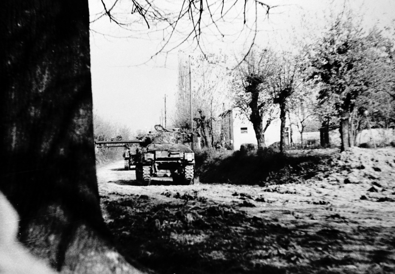 Sherman tanks prepare for a shoot on the road about 1/2 mile from Faenza. Un carro armato Sherman, a meno di 1km da Faenza, si prepara a sparare.