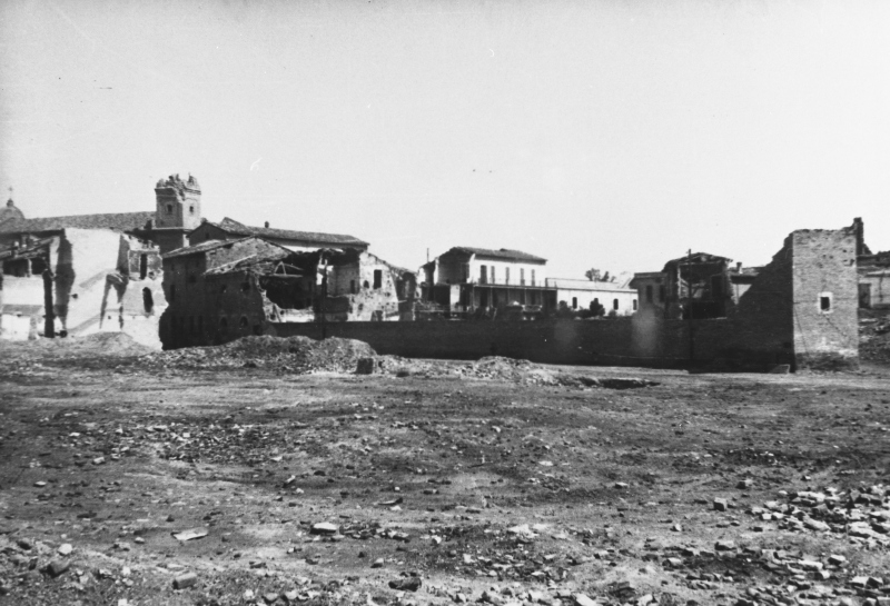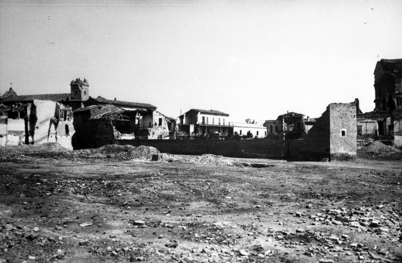 A sinistra si nota il campanile decapitato di S. Francesco e sulla destra la mole della chiesa di S. IppolitoDonazione: