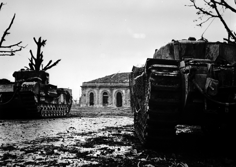 A few yards from the battered railway station at Faenza, two tanks shell enemy positions to the North. The Germans were answering with mortar fire.