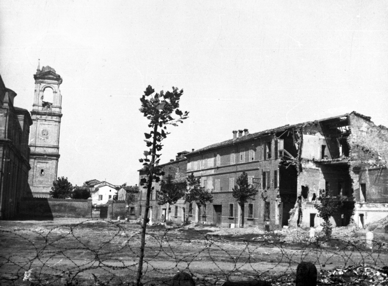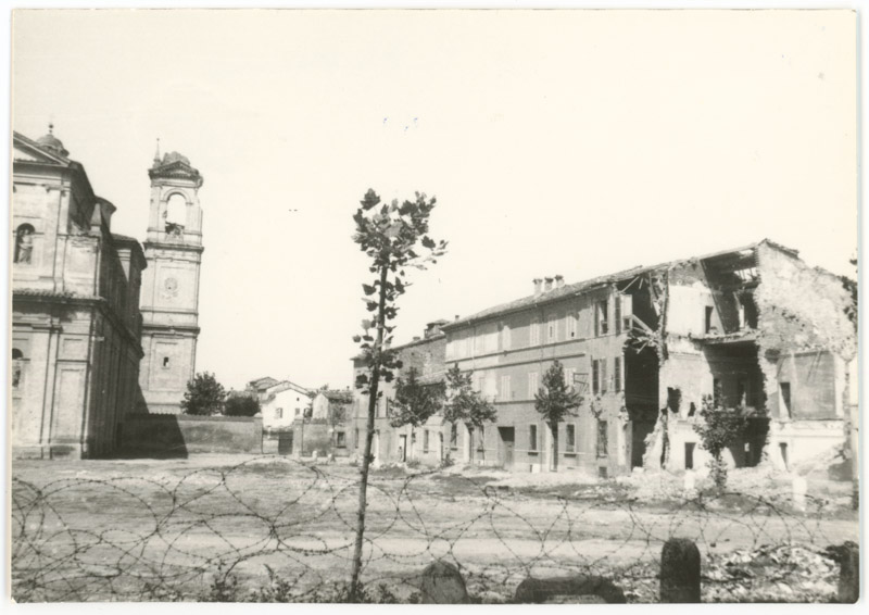 Il punto di ripresa, in via Martiri Ungheresi, mostra le distruzioni causate dai bombardamenti alleati del 1944 in piazza San Domenico. È, inoltre, ben visibile il campanile danneggiato della omonima Chiesa.Donazione: