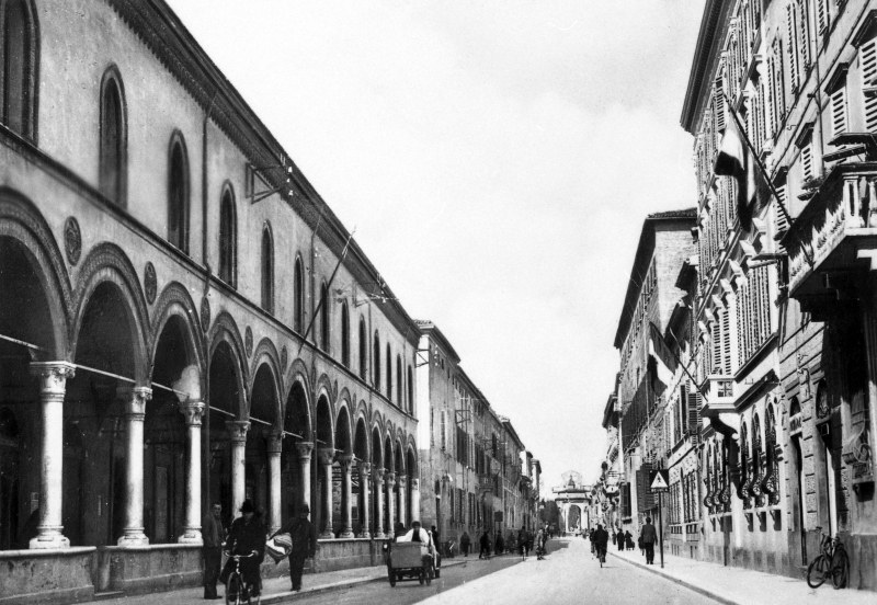 In primo piano a sinistra, il palazzo e il loggiato della Beneficenza e porta Imolese sullo sfondo