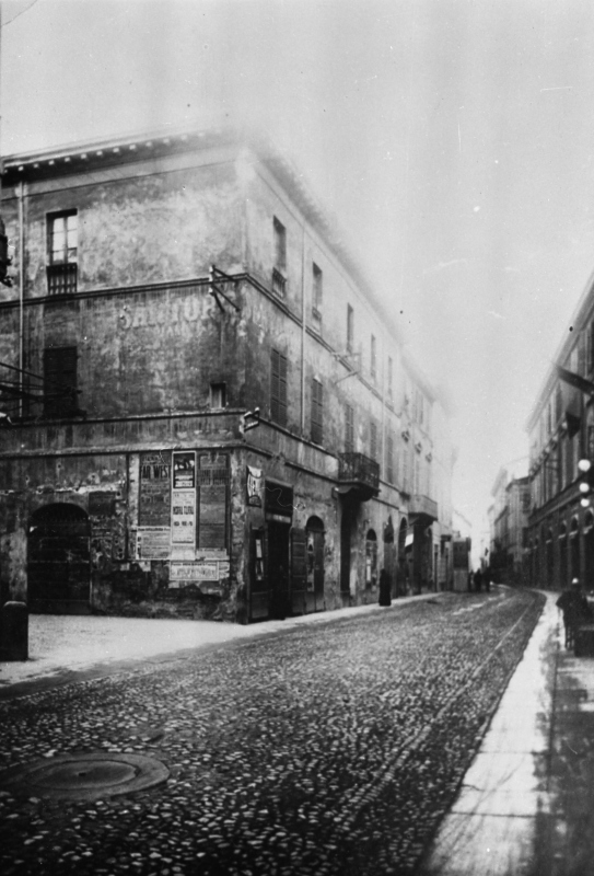 In primo piano a sinistra palazzo Bertolazzi al cui posto, dopo la demolizione avvenuta nel 1924, si trova oggi la nuova sede del Credito romagnolo