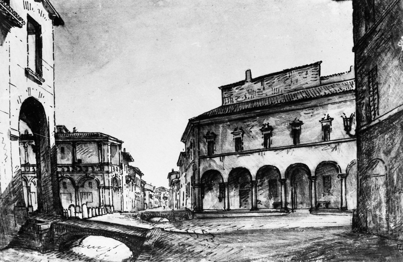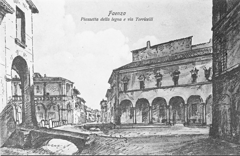 Cartolina tratta da un'incisione di Romolo Liverani (1809 - 1872) che ritrae la Piazzetta della Legna vista da Via SeveroliDatazione:
