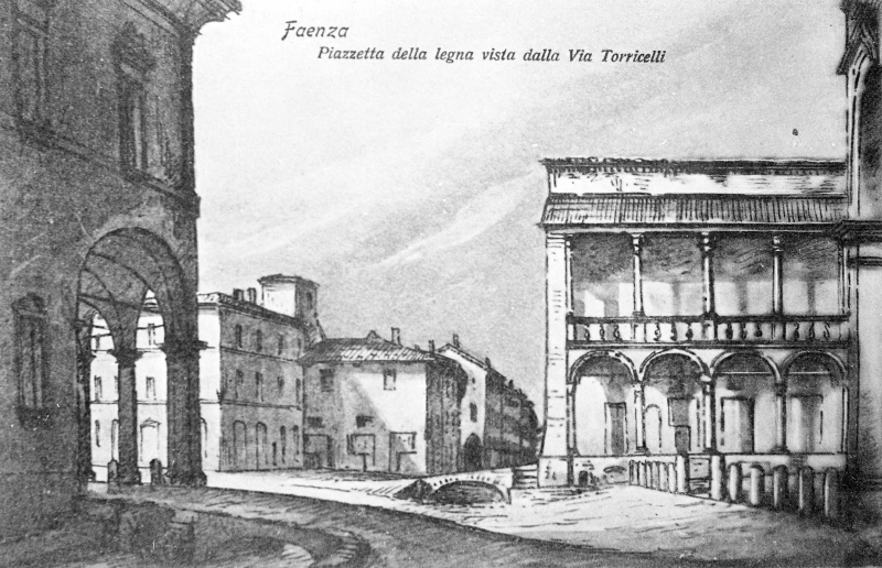 Cartolina tratta da un'incisione di Romolo Liverani (1809 - 1872) che ritrae la Piazzetta della Legna vista da Via TorricelliDatazione:
