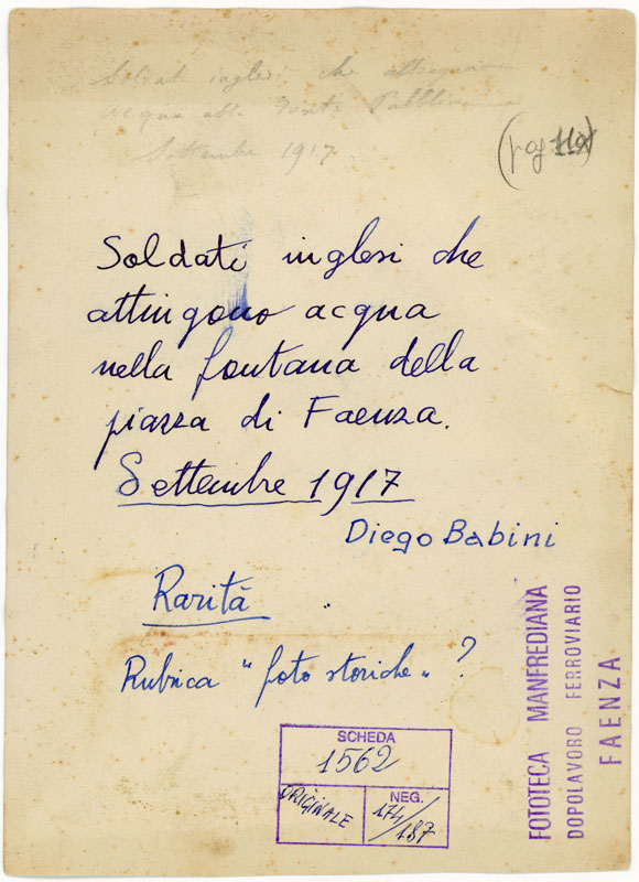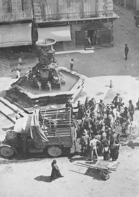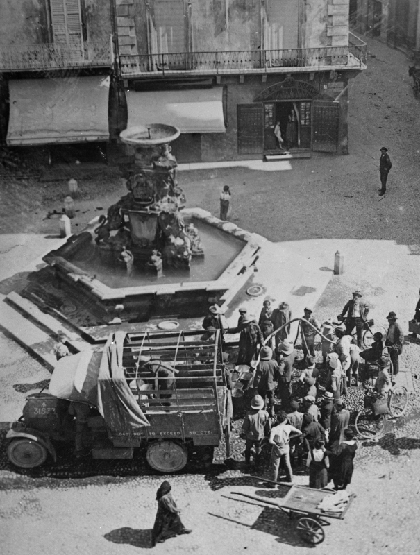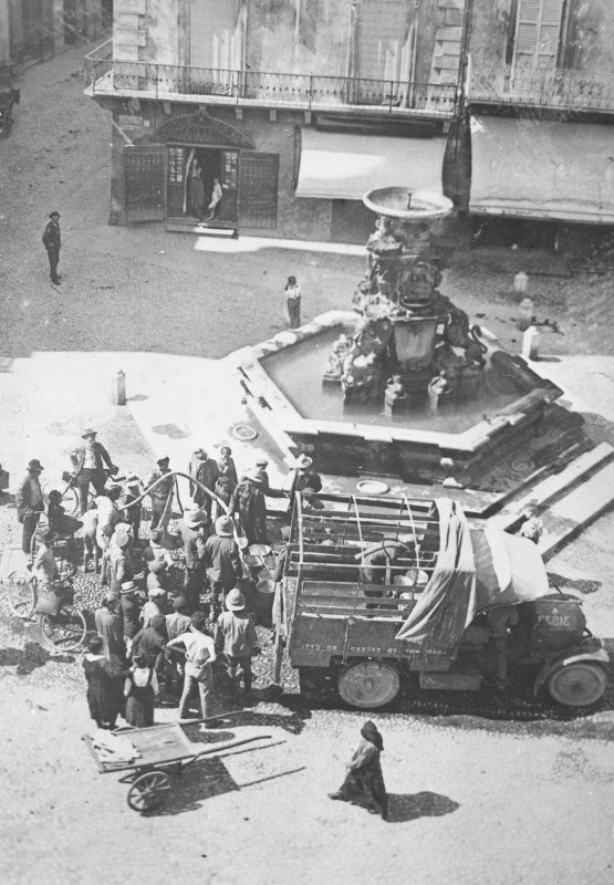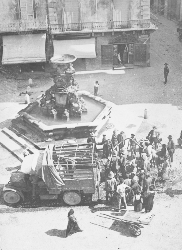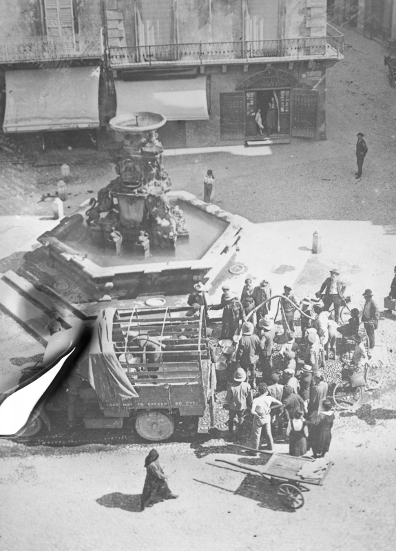 Fotografia che ritrae dei soldati inglesi che attingono l'acqua dall'idrante posto al lato del Fonte MonumentaleDatazione: