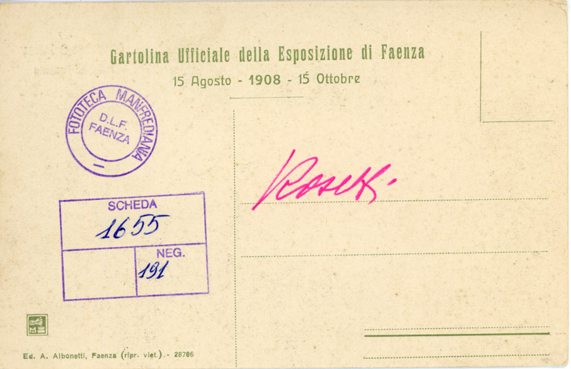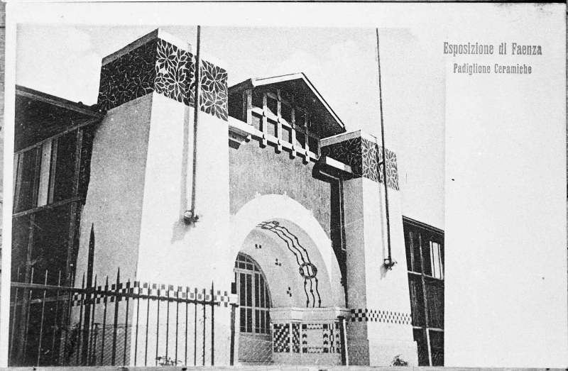Cartolina edita in occasione della Esposizione di Faenza del 1908 raffigurante il Padiglione delle CeramicheDatazione: