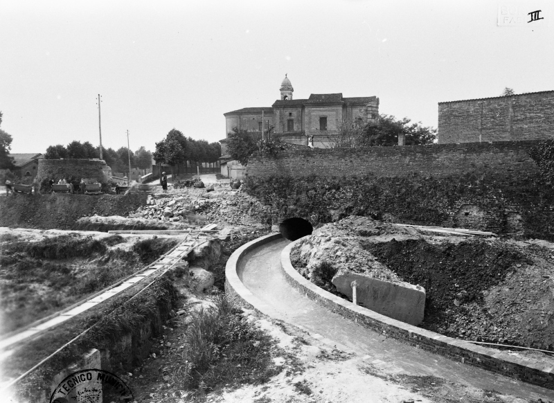 Lavori di copertura e inalveamento del Canal Naviglio Zanelli e vasca del Borgotto. Sullo sfondo la chiesa di Sant'IppolitoDonazione: