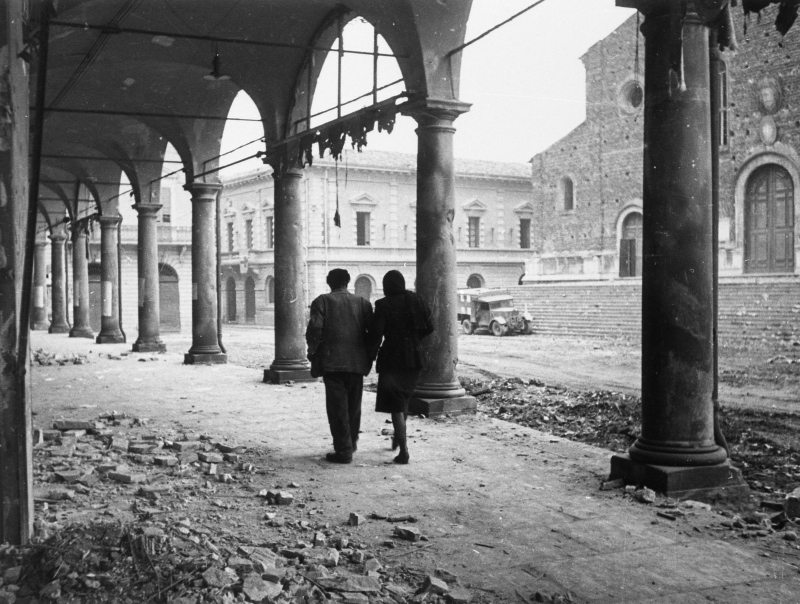 Ripresa di una coppia di civili che percorre il loggiato degli Orefici, due giorni dopo la liberazioneDatazione: