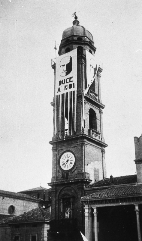 Dettaglio della Torre Civica di Faenza durante una manifestazione fascistaDatazione: