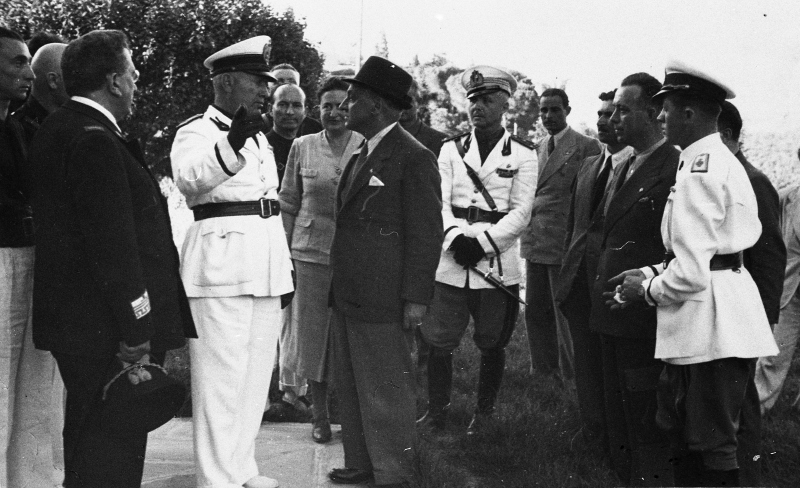 Benito Mussolini in visita a Faenza conversa con l'ingegnere Luigi Bubani, direttore tecnico dei bacini montani.Ulteriori informazioni