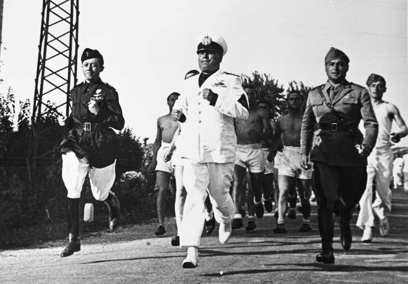 Fotografia che ritrae Mussolini di corsa davanti a giovani fascisti