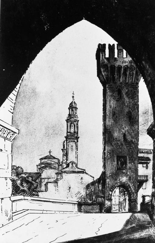 Cartolina tratta da un'incisione di Romolo Liverani (1809 - 1872) che ritrae il Ponte Romano dalla torre di mezzoDatazione: