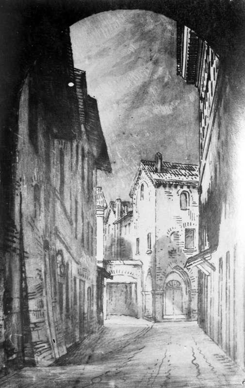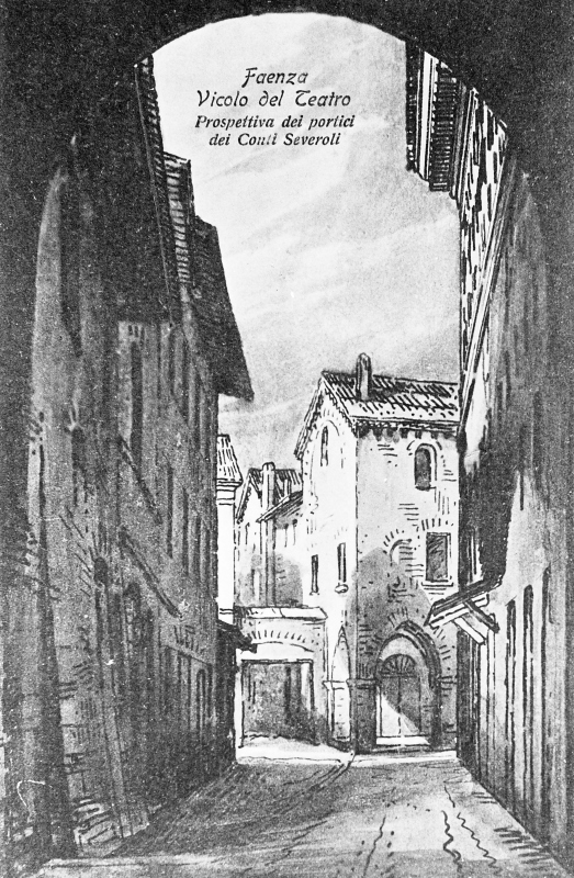 Cartolina tratta da un'incisione di Romolo Liverani (1809 - 1872) che ritrae il Vicolo del Teatro e in prospettiva i portici del palazzo dei Conti Severoli