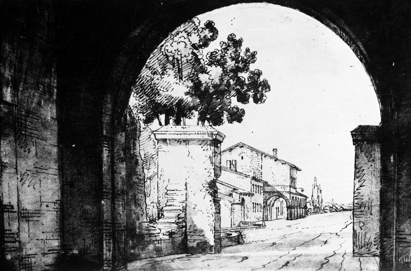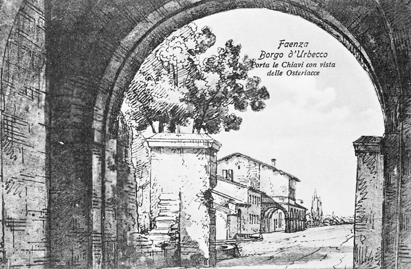Cartolina tratta da un'incisione di Romolo Liverani (1809 - 1872) che ritrae la Porta delle ChiaviDatazione:
