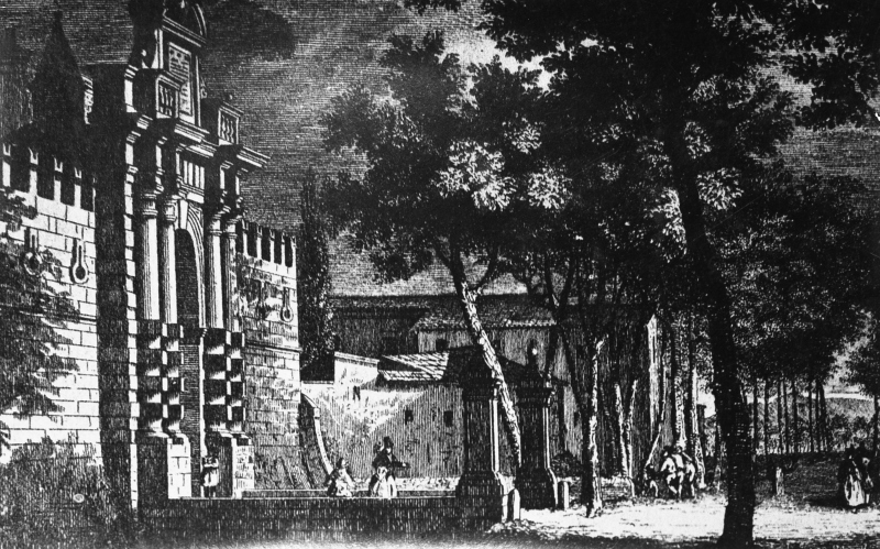 Cartolina tratta da un'incisione di Romolo Liverani (1809 - 1872) che ritrae l'esterno di Porta ImoleseDatazione:
