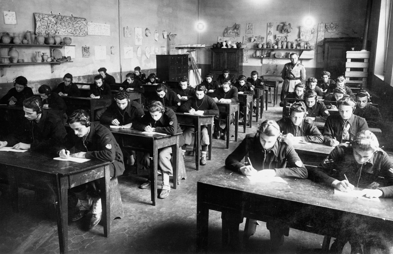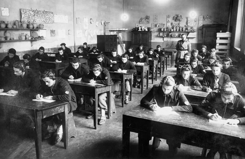 Fotografia che ritrae dei giovani durante il "Corso allievi marconisti", classe 1921 (anno 1939/40). L'addestramento veniva fatto bisettimanalmente, nell'aula di Plastica dell'Istituto Tecnico A. Oriani in Via Cavour.