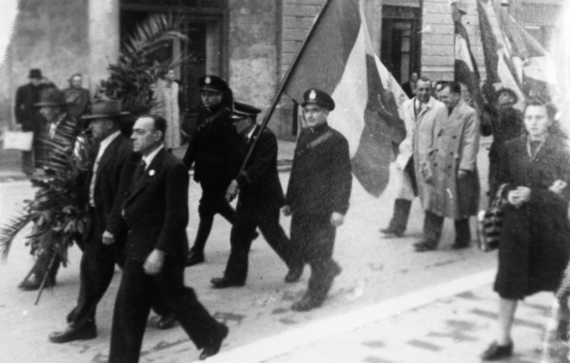 La fotografia ritrae il corteo di combattenti, mutili e reduci della guerra in Corso Matteotti, in occasione dell'Anniversario della vittoria 1915-18. Si notano: Chiusi Salvatore, i vigili urbani Rossini Giulio e Fiorani Gino, il portabandiera Luigi Venturelli, Cesare Pislanti e Lino CelottiDonazione:
